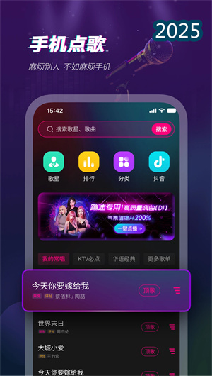 多唱APP搭載行業領先的曲庫搜索引擎,提供模糊匹配和語音點歌等多種檢索方式。通過掃碼連接技術,用戶可快速綁定包廂設備,實現手機點歌、切歌控制和音量調節等操作。收藏歌單支持跨店同步,歷史記錄智能推薦,讓點歌效率提升60%,徹底告別傳統點歌臺的繁瑣操作。2. 沉浸式互動娛樂