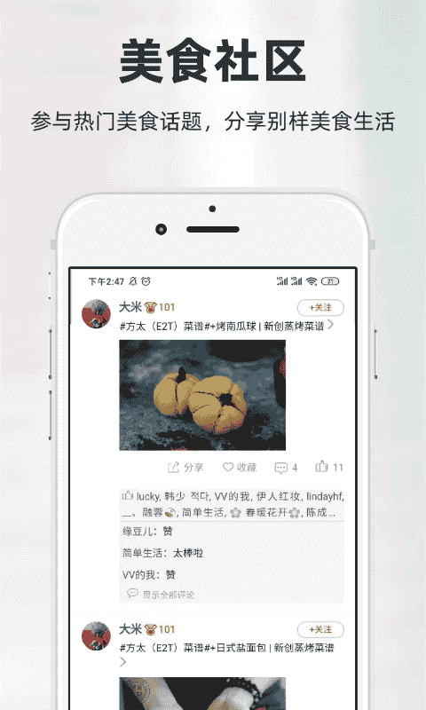 3、在廚房日記可以分享美食,也可以搜索美食達人和日記,是一個溫馨滿滿的美食交流大家庭,如#曬年味、享團圓#椰蓉蔓越莓吐司;一碗有滋有味的炒刀削面;新創蒸烤菜譜、奧利奧奶油塔。