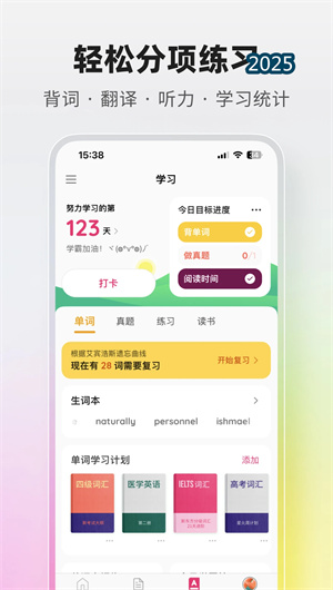 火龍果APP的記憶算法根據艾賓浩斯曲線安排復習時間,多模態背詞結合圖片、例句等多種記憶方式。真題詞庫聚焦高頻考點詞匯,聽寫模式強化拼寫能力。詞匯量測試定期評估學習成果,科學指導背詞計劃,顯著提升記憶效率。