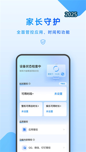 “管一管”模塊是我們設計的一站式管控解決方案,集成了所有核心遠程控制指令。家長可在此輕松設置每日可用時長、強制執行定時設備鎖屏,并創建靈活的個性化使用計劃(如周末放寬、學期中收緊)。更重要的是,它能對設備上的所有應用及小程序生態進行啟用/禁用授權管理,確保孩子接觸的內容始終健康合規。此外,高級功能如上網行為管理和網址黑白名單過濾,共同構筑了一道堅實的數字安全圍欄。