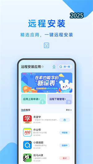 此功能徹底解決了家長為孩子尋找和安裝優質學習資源的煩惱。通過與我們官方的應用商店無縫對接,家長無論身處何地,都能一鍵發起遠程安裝請求,經審核后的優質App便會自動下載并安裝到孩子的家教機上。同時,家長亦能遠程卸載不必要的或存在潛在風險的應用,并對家教機內的本地文件和緩存數據進行批量管理,確保設備存儲空間的整潔與運行流暢,從源頭上把控孩子的數字內容攝入質量。
