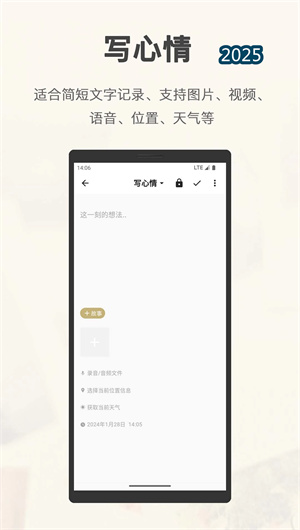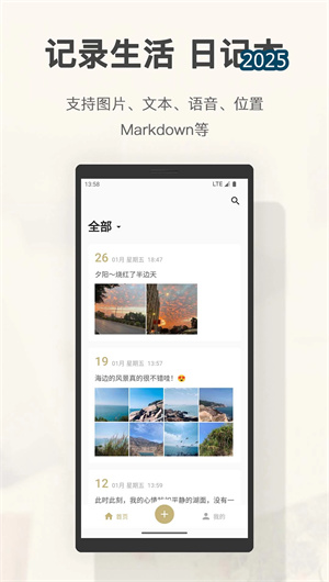 2. 多媒體混合記錄功能:支持心情短記與Markdown長文混合編排,可嵌入圖片、視頻、地理位置、錄音及天氣信息等多元模塊。通過元數據標簽系統自動歸類內容,并依托高壓縮存儲技術優化空間占用,用戶可自定義日記保存時長,并通過圖庫模式快速瀏覽媒體資產。