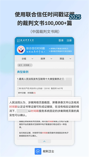 權(quán)利衛(wèi)士存證內(nèi)容已被累計引用超11萬次于裁判文書,覆蓋全國所有省級行政區(qū)。其采用的聯(lián)合信任可信時間戳與區(qū)塊鏈技術(shù)多次被最高人民法院典型案例收錄,電子證據(jù)司法采信率高達98.7%,成為個人及企業(yè)維權(quán)的權(quán)威工具。