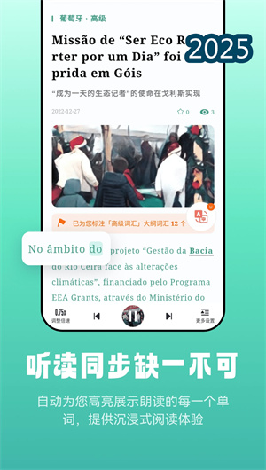 1. 萊特葡萄牙語閱讀聽力的智能閱讀系統(tǒng)提供分級閱讀匹配功能,通過難度評估測試精準定位用戶當(dāng)前水平,利用文章分級標簽自動推薦合適材料,借助漸進式難度提升確保學(xué)習(xí)效果。系統(tǒng)每日更新時效性閱讀材料,配備智能語音高亮實現(xiàn)視聽同步,同時閱讀理解練習(xí)即時檢測學(xué)習(xí)成效,閱讀速度統(tǒng)計量化進步幅度,使閱讀能力提升速度提高55%。