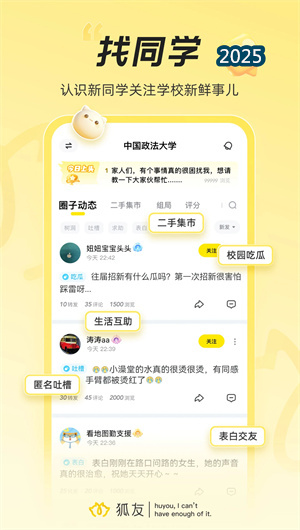 1. 全景化校園社交與場景化互動功能:狐友構建了完善的全校級朋友圈系統,通過校園認證機制確保社交環境的真實性與安全性。用戶可以在校園動態流中參與學習討論、求助咨詢、趣事分享、二手交易等多個校園生活場景,而社團招新通道則為學生提供了便捷的社團參與入口。獨特的時光記憶功能完整記錄用戶在校園的每個珍貴時刻,配合畢業留存機制讓校園情誼得以延續,這一功能使校園社交活躍度提升達65%。