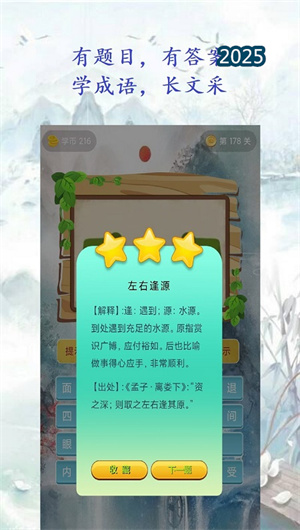 2. 趣味互動平臺精心設計多元化的國學游戲矩陣,其中"看圖猜成語"模塊融合圖像識別與語義分析技術,通過智能提示系統引導用戶逐步破解成語謎題。"詩詞大考驗"游戲則采用闖關晉級模式,配備實時評分系統與錯題集記錄功能,讓使用者在輕松氛圍中鞏固詩詞知識。所有游戲數據均會同步至個人學習檔案,形成完整的能力評估報告。