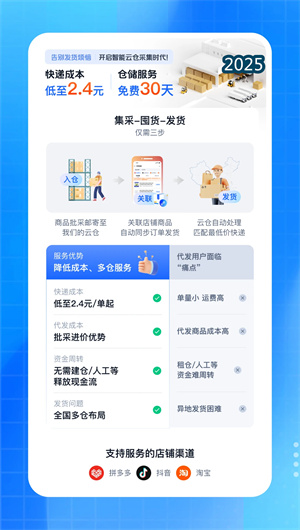 后鳥云倉通過集中采購整合供應商資源,獲得批采進價優勢,幫助賣家降低采購成本15%-20%。創新的物流集采模式將分散訂單整合為批量運輸,快遞成本低至2.4元/單起。專業的成本分析工具詳細展示各項費用構成,優化建議指導賣家進一步壓縮代發成本,提升整體利潤空間。