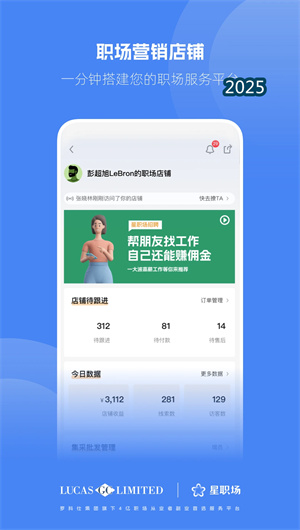 星職場創新推出"零成本創業"店鋪系統,用戶通過店鋪裝修功能可快速定制個性化店鋪界面。平臺提供完善的商品上架服務,支持用戶自主上傳產品至商品庫,或從平臺供應鏈系統精選優質商品。每個店鋪均配備專業銷售工具,包括客戶管理系統、訂單跟蹤功能和數據看板,幫助合伙人實時掌握經營狀況,優化銷售策略,提升轉化效率。