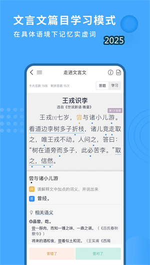 跬步千里App是一款專注于國學經典與傳統文化傳承的智能學習平臺,以 深度文言文 為核心特色,通過科學記憶算法與智能化學習路徑,為用戶構建系統化的古詩文學習體系。該應用深度整合經史子集等經典國學名篇,結合現代教育心理學與認知科學理論,打造了集文本解析、文化賞析、記憶強化于一體的綜合性學習方案。平臺目前收錄了從先秦至明清的3000余篇經典文言文作品,配備專業的注音、注釋和譯文系統,日均學習時長超過40分鐘的用戶占比達65%,成為國學教育領域頗具影響力的數字化學習工具。