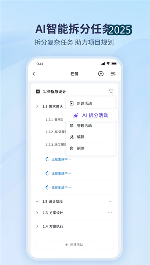 項目執APP內置了強大的 “智能工作流引擎” 。用戶可以基于三級任務列表的邏輯與依賴關系,定義自動化的規則。例如,規則可以設定為“當‘設計評審’任務標記為完成后,自動創建并分配‘UI開發’任務給前端小組,并觸發通知”。更智能的是,結合AI項目助理對任務內容的理解,系統可以建議最優的任務執行順序、資源分配方案甚至截止日期,實現部分程度的 “智能任務編排” 。對于重復性的項目管理工作(如定期收集成員進度、發起周會預約),可以設置完全自動化的流程,將項目經理從繁瑣的行政工作中解放出來,專注于更具戰略價值的活動。