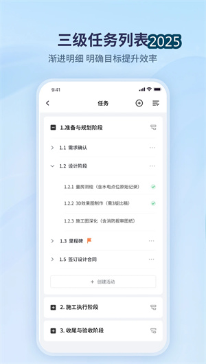 項目執APP的核心組織單元是 “獨立的項目模塊” 。每個模塊為一個完整的項目提供專屬的工作空間,包含所有相關的文檔、任務、溝通記錄與報告。在此模塊內,項目執采用獨特的 “三級任務列表” 體系對工作進行系統拆解:一級為項目里程碑或主要階段,二級為核心交付物或關鍵任務集,三級為具體可執行、可分配的個人任務項。這種層層遞進、邏輯清晰的拆解方式,確保項目目標被完整、無遺漏地轉化為行動計劃。每個任務項支持設置負責人、截止日期、優先級、依賴關系及所需資源,并通過可視化的甘特圖或看板視圖動態呈現整體進度,使項目脈絡一目了然,復雜項目的規劃清晰度平均提升40%。