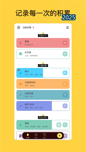 小積累APP的核心功能是其強大的日常習慣打卡系統。用戶可以創建覆蓋健康、學習、工作、生活等維度的各類習慣,例如“每日早起”、“堅持吃早餐”、“規律鍛煉身體”。對于每個習慣,用戶可靈活設置追蹤模式:既可進行簡單的“是/否”完成打卡,也可進行次數記錄(如“今天喝了幾杯水”、“本周給爸媽打了幾次電話”),更支持投入時長記錄(如“專注學習3小時”、“冥想20分鐘”)。尤為強大的是,用戶可以為習慣設定每日計劃(如“每天計劃喝8杯水”)和宏偉的總目標(如“累計跑步1000公里”、“完成一萬小時定律的專項訓練”)。系統會自動計算完成進度,并以進度條、數字等形式清晰展示,讓目標的實現過程一目了然。