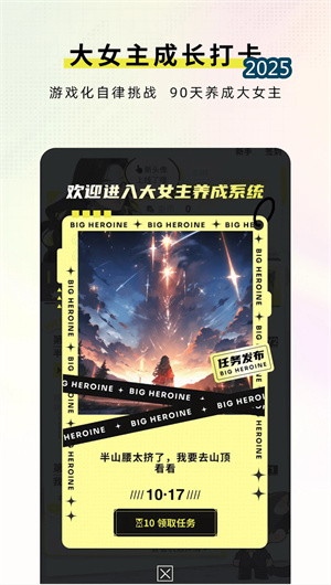 本應用現已集成超過300個成長維度、1000+任務模板、200位榜樣女性的成長軌跡數據,形成了目前全球最完善的大女主成長知識圖譜。我們相信,每一位女性體內都蘊藏著尚未覺醒的王者之力,而我們的使命就是通過科技與設計的融合,讓這種力量以可追溯、可加速、可共享的方式綻放。在這趟人生升級之旅中,你不是孤身一人——系統、社群與更廣闊的成長生態將共同構成你的“王室顧問團”,陪伴你從當下的自己,走向命運劇本中那個光芒萬丈的大女主。目前,早期用戶的年度目標達成度已提升至76%,我們期待與更多女性一起,重新定義成長的可能邊界。