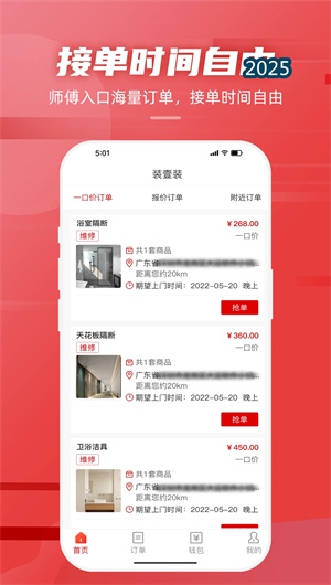 裝壹裝APP為消費者提供了便捷的 “一鍵下單” 功能。用戶可根據具體需求(如燈具安裝、管道維修、柜體定制測量)清晰描述問題,平臺會智能推薦匹配的服務品類與參考報價。下單后,系統的 “智能派單引擎” 會依據訂單要求、師傅的技能標簽、歷史評價、實時位置及接單意愿,將訂單推送至最合適的認證師傅。對于師傅端,平臺提供了高效的 “自由接單大廳” ,師傅可根據自身專長與時間安排,自由搶單或接收系統精準派單。訂單生成后,雙方可通過APP內置的溝通工具確認細節,用戶可在 “我的訂單” 中實時跟蹤訂單狀態,從“待接單”、“服務中”到“待支付”、“已完成”,全流程透明可視。