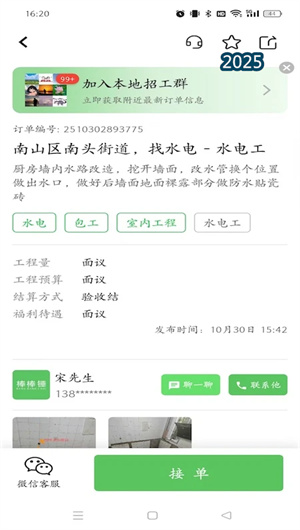 對于裝修師傅、工地小工等施工人員,棒棒錘APP是其獲取穩(wěn)定收入的專屬平臺。平臺每日更新海量裝修訂單,覆蓋從大型家裝/工裝項目到零散維修的各類需求。師傅可根據(jù)自身工種專長和時間安排,在 “自由接單大廳” 中自主挑選訂單,實現(xiàn) “多勞多得,收入無上限” 。接單后,師傅可通過APP內(nèi)置工具與需求方溝通細(xì)節(jié)、確認(rèn)方案。在施工過程中,雙方可更新訂單狀態(tài)、上傳階段性成果照片。訂單完成后,需經(jīng)需求方在APP內(nèi)確認(rèn)驗收,方可進(jìn)入結(jié)算流程。整個 “從接單到完工” 的過程清晰透明,所有記錄均留存在平臺,便于追溯與管理。