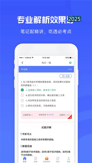 益題庫APP的核心是構建了覆蓋建工類(如一級建造師)、醫衛類(如執業醫師)、財會類(如注冊會計師)、電商運營等數十個熱門職業資格考試的 “海量智能題庫” 。題庫內容嚴格遵循最新考試大綱,包含歷年真題、權威模擬題及高頻考點題。平臺提供多種刷題模式: “章節練習” 幫助鞏固基礎知識; “智能組卷” 模擬真實考試環境; “錯題自動歸集” 功能便于針對性復習。更關鍵的是其 “智能出題引擎” ,能夠根據用戶的做題記錄,動態分析其知識薄弱環節,并個性化推送相關強化習題,實現 “哪里不會練哪里” 的精準訓練,讓每一次練習都直擊要害。