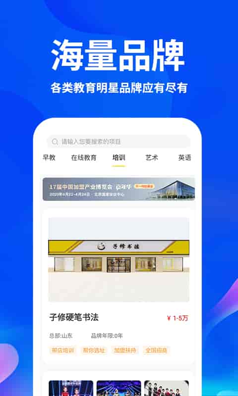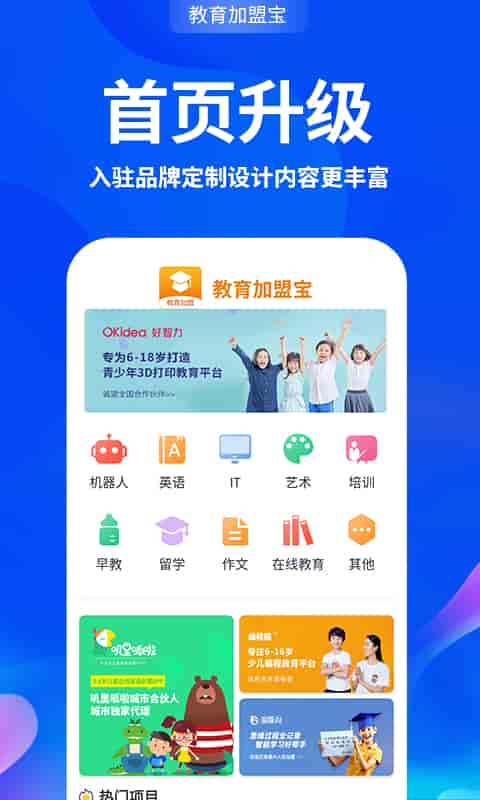 2、多種加盟行業(yè)可供選擇,如早教、作文、潛能、藝術(shù)培訓(xùn)、母嬰、幼兒、英語(yǔ)、機(jī)器人教育、在線教育、嬰兒游泳館、兒童樂(lè)園等行業(yè)。