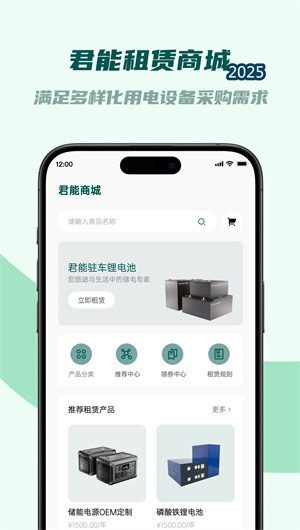 針對電池更換成本高昂、臨時需求迫切的痛點,君能App內置了功能完善的B2C電池租賃垂直電商平臺。商城內匯集了覆蓋市面上主流商用車品牌與型號的高適配性租賃電池產品,每款電池都配有詳細的規格參數說明、適用車型清單、租賃價格方案及用戶評價。司機通過 “車型智能匹配”功能或手動篩選,可快速找到最適合自己車輛的租賃電池選項。租賃流程高度數字化,支持在線信用免押租賃、靈活租期選擇、預約配送安裝及電子合同簽署。當租賃期滿或司機決定購買新電池時,可通過電池回收估值功能獲得舊電池殘值評估與回收服務,實現電池資產的閉環管理。