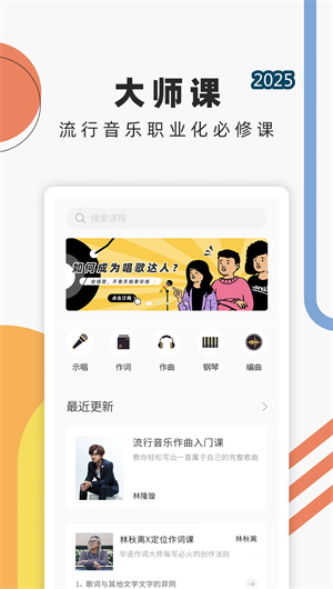 音樂人星球App的核心功能是其精心構(gòu)建的 “大師課”系列課程矩陣。平臺深度整合華語知名創(chuàng)作人資源,圍繞作詞技法、作曲理論、演唱技巧、編曲實(shí)戰(zhàn)四大專業(yè)支柱,開發(fā)了從基礎(chǔ)到高階的階梯式課程內(nèi)容。每門課程均由大師親自設(shè)計(jì)并主講,內(nèi)容不僅涵蓋嚴(yán)謹(jǐn)?shù)囊魳防碚摚谌肓舜髱焸儶?dú)特的創(chuàng)作心得與行業(yè)經(jīng)驗(yàn),旨在為用戶開啟真正的音樂職業(yè)化之路。課程采用高清制作標(biāo)準(zhǔn),配合詳實(shí)的課件資料庫與經(jīng)典案例分析,確保學(xué)習(xí)內(nèi)容的專業(yè)性與啟發(fā)性。學(xué)員可隨時加入學(xué)習(xí),通過個人學(xué)習(xí)中心追蹤進(jìn)度,形成清晰的知識地圖。