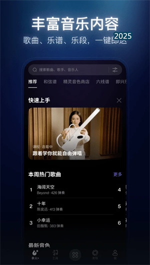 拿火+App的核心是內(nèi)置的海量智能化歌曲譜庫。庫內(nèi)精選并持續(xù)更新超過500首涵蓋不同風格與難度的熱門歌曲,每首歌曲均配有專為拿火智能吉他優(yōu)化的 “易讀易彈奏”動態(tài)吉他譜。該譜庫采用智能難度分級系統(tǒng),從“小白”到“大神”級別的用戶都能找到適合自己的曲目。當用戶選擇一首歌曲后,App會通過藍牙與拿火智能吉他連接,琴頸上的LED指示燈可同步指引指板位置,實現(xiàn)可視化跟彈學(xué)習。同時,每首歌均提供高質(zhì)量的原版樂隊多軌伴奏,用戶可自由開關(guān)鼓點、貝斯等音軌,讓單一把吉他的彈奏也能立刻呈現(xiàn)出層次豐富、動聽的完整樂隊效果。