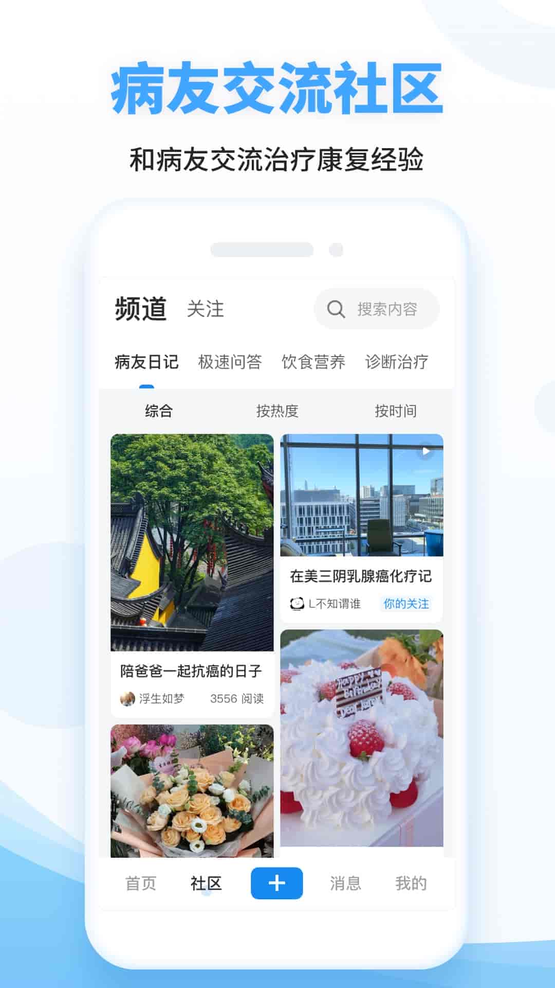 2、頻道:病友日記、抗癌經驗、營養/飲食、科普/資訊、康復/護理、藥物/副作用。