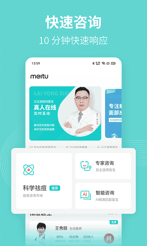 2、咨詢:問題肌護膚專場、專家咨詢(自主選擇醫生)、智能問醫(AI精準匹配醫生)。
