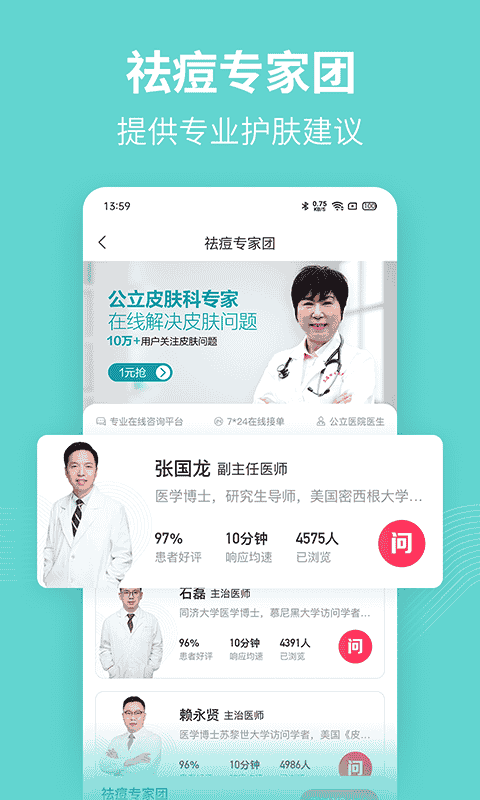 2、公立皮膚科醫生真人在線實時互動,解決您的皮膚問題,保護您的皮膚健康。