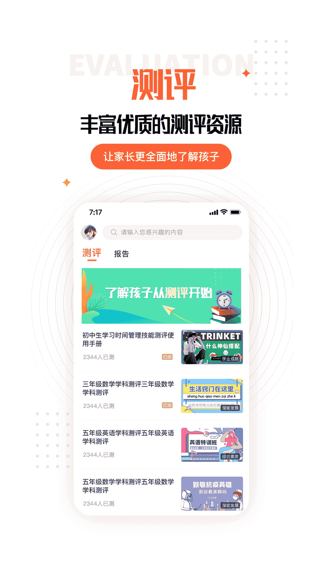 2、專(zhuān)業(yè)成長(zhǎng)測(cè)評(píng),如天賦興趣、心理健康、性格特點(diǎn)、綜合能力、親子關(guān)系,讓家長(zhǎng)更全面地了解孩子。