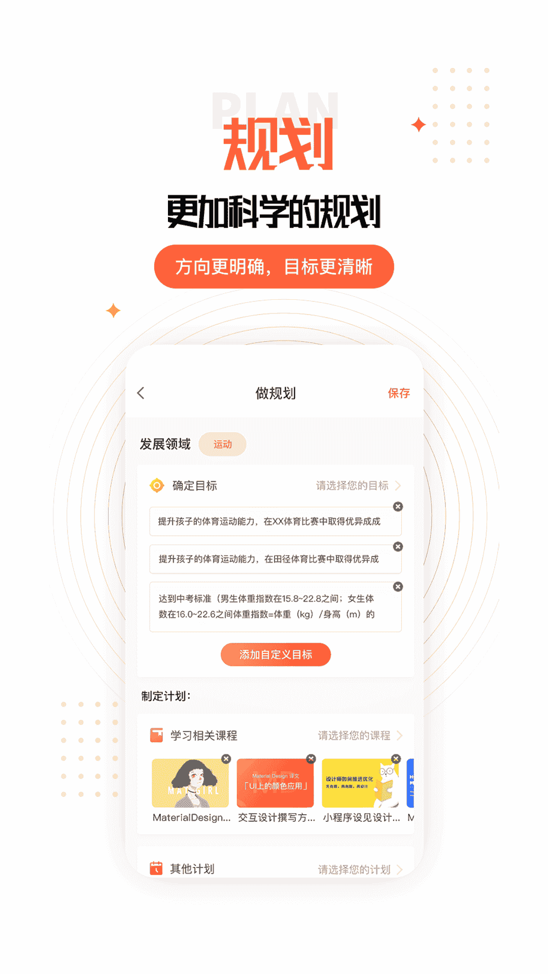 1、科學(xué)規(guī)劃體育運(yùn)動(dòng)、文化藝術(shù)、科學(xué)技術(shù)、語(yǔ)言發(fā)展,方向更明確,目標(biāo)更清晰。