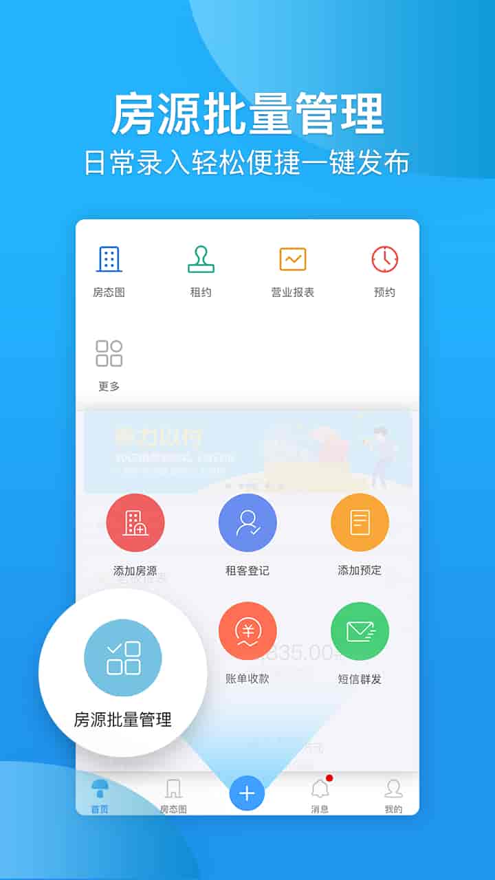 3、管理:房源批量管理(添加房源、租客登記、添加預定、賬單收款、短信群發)。