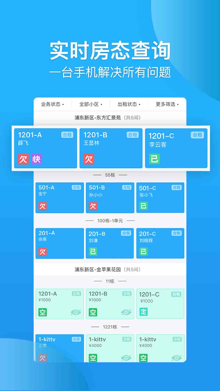 1、房態查詢:業務狀態、小區位置、出租狀態、更多篩選。