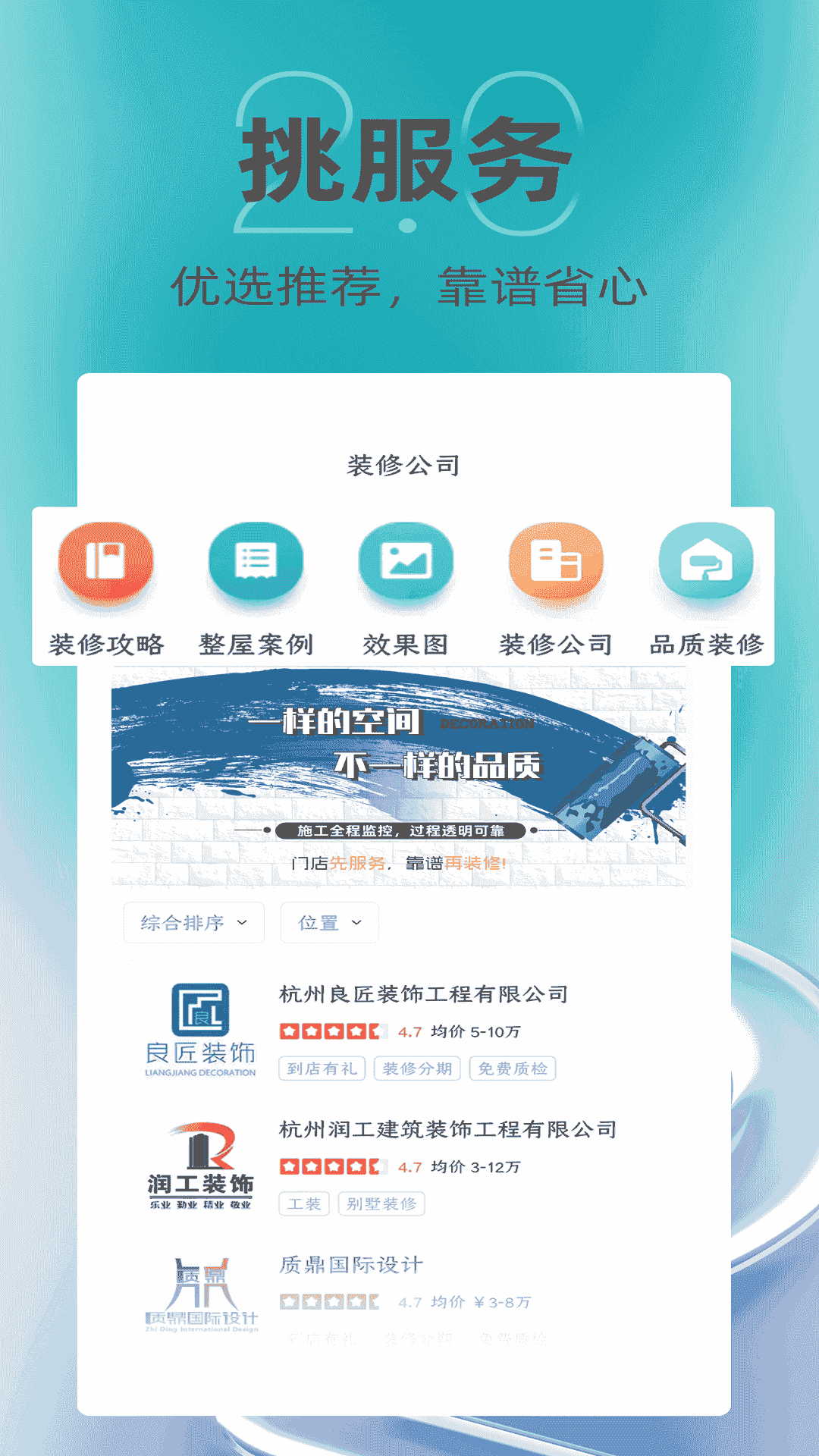 3、做攻略,掌握避坑指南,拒絕焦慮;圖省心,全品類商家入駐,高效選擇;全透明,把控裝修流程,眼見為實。