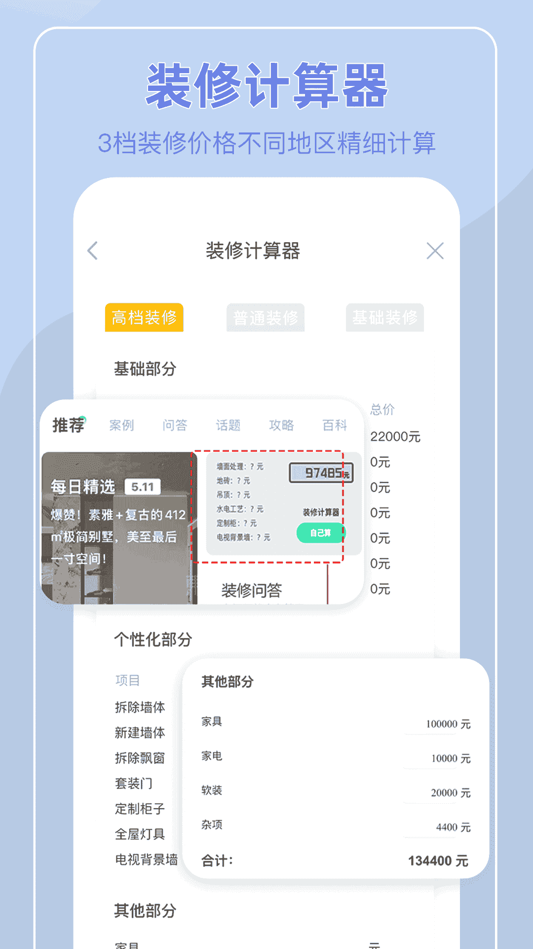 1、裝修小白的福音,一站式解決裝修難題,在這兒可以看案例、算報價、找設(shè)計、聊裝修、學(xué)攻略。