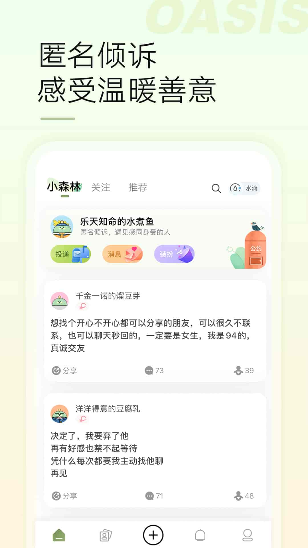 3、小森林匿名世界,這里是你的秘密世界,可以盡情傾訴你的心事,也會向你發送陌生人的故事,期待你真誠的回應。