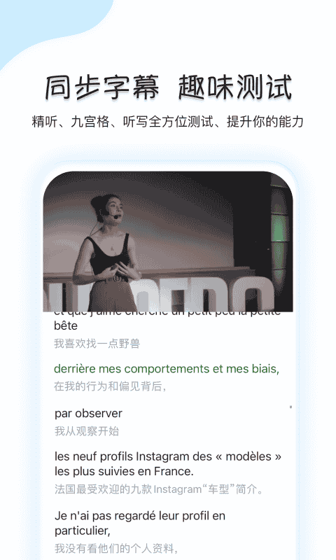 2、同步字幕,趣味測試,精聽、九宮格、聽寫全方位測試;逐句跟讀,提升口語,地道的發音,精準提升你的口語表達能力。