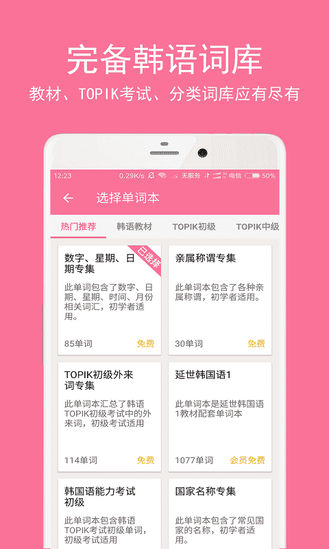 1、完備韓語詞庫,教材、TOPIK考試、分類詞庫應有盡有,讓學習韓語變得簡簡單單。