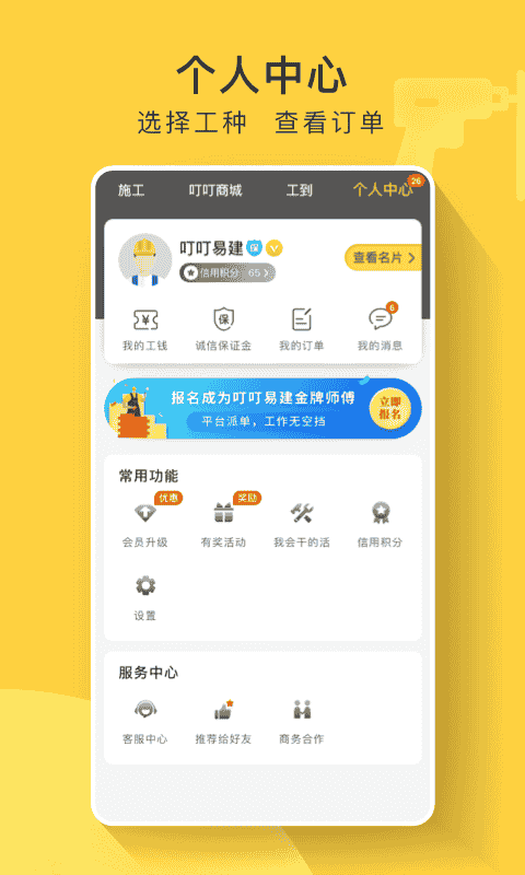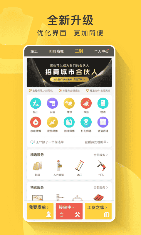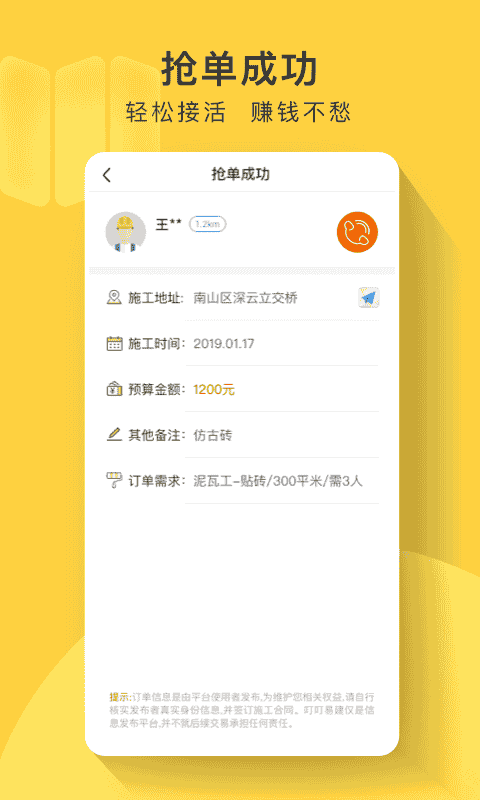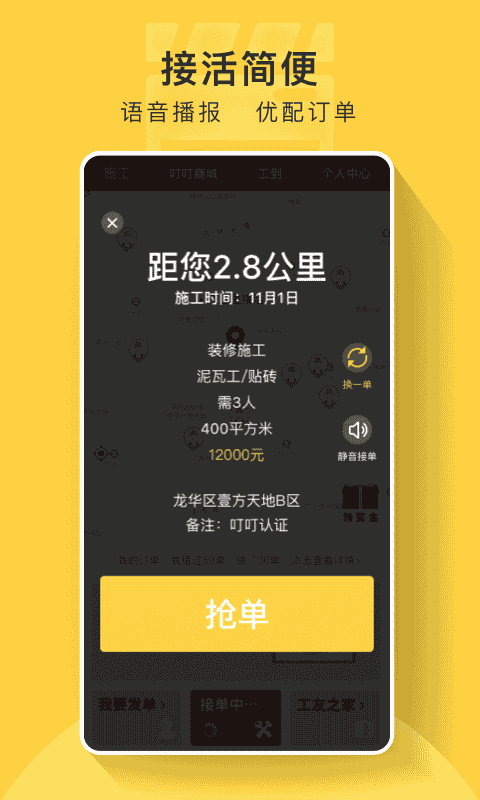 3、工人找活輕松,工種齊全隨時(shí)隨地有活干;接活簡(jiǎn)便,語(yǔ)音播報(bào),優(yōu)配訂單;搶單成功,輕松接活,賺錢不愁。