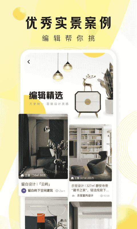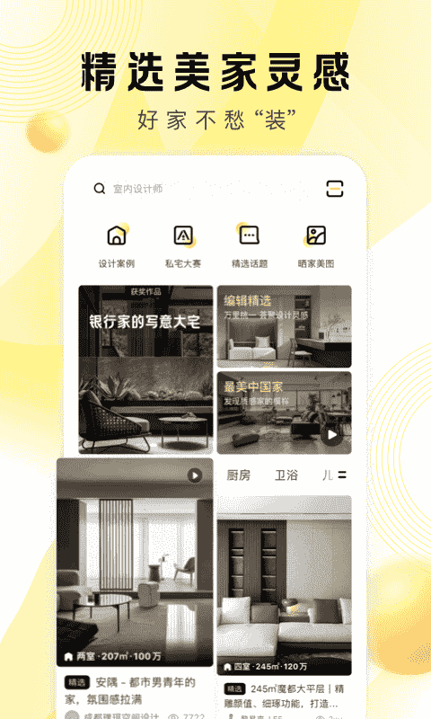 2、精選美家靈感,好家不愁裝;潮流美家圖集,創意隨心看;優秀實景案例,編輯幫你選,您的裝修居住指南。