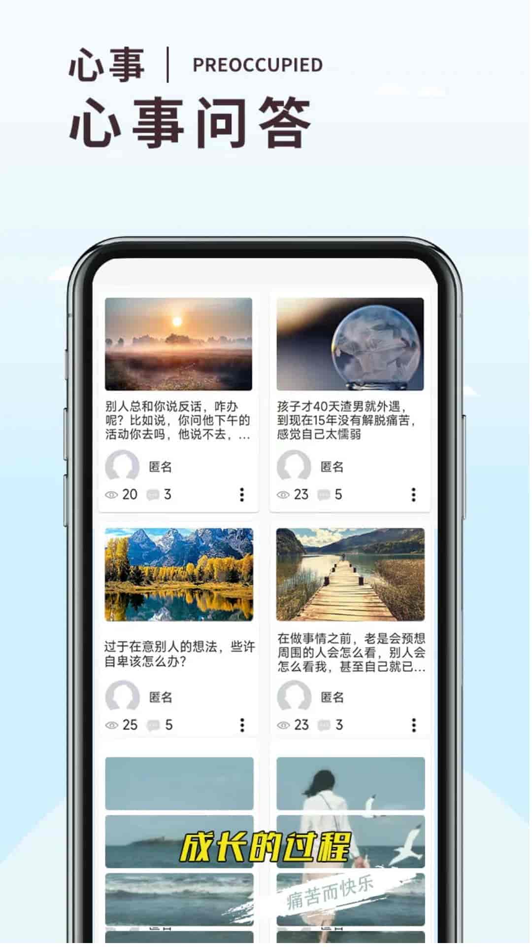 3、心事問答不容錯過,讓您重新認識自己,細致入微的解答,在自我成長的道路上讓您又向前邁進了一步。