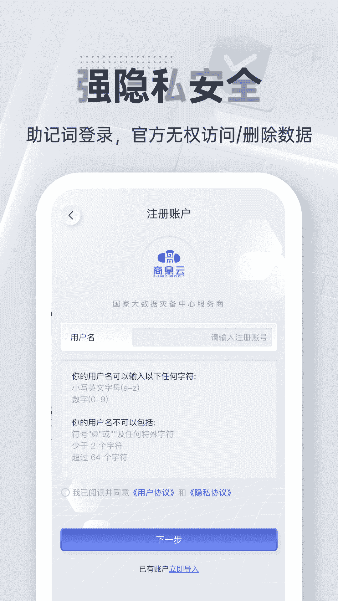 商鼎云-強隱私文件存儲備份云盤v3.5.1是一款專為企業和個人用戶打造的高度安全、穩定、強隱私的文件存儲備份云盤。我們致力于為用戶提供一站式的云存儲解決方案,保障數據安全,確保隱私不被泄露。商鼎云采用了先進的加密技術、多重備份策略和智能同步功能,讓您在享受云存儲便捷性的同時,充分保障您的數據安全與隱私。