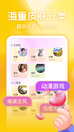2、皮膚分類:軟件將皮膚進行了分類,如風景、動漫、文字等,方便用戶快速找到自己喜歡的類型。