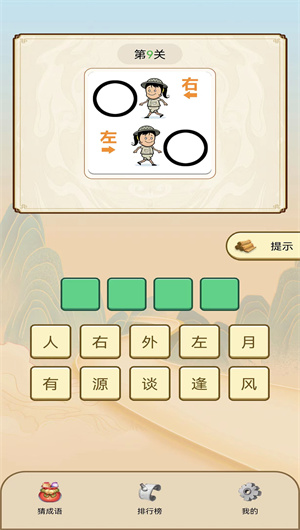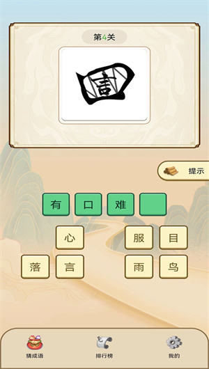觀看插畫(huà):每個(gè)關(guān)卡都有一個(gè)與成語(yǔ)相關(guān)的精美插畫(huà),玩家需要通過(guò)觀察插畫(huà)來(lái)猜出對(duì)應(yīng)的成語(yǔ)。
