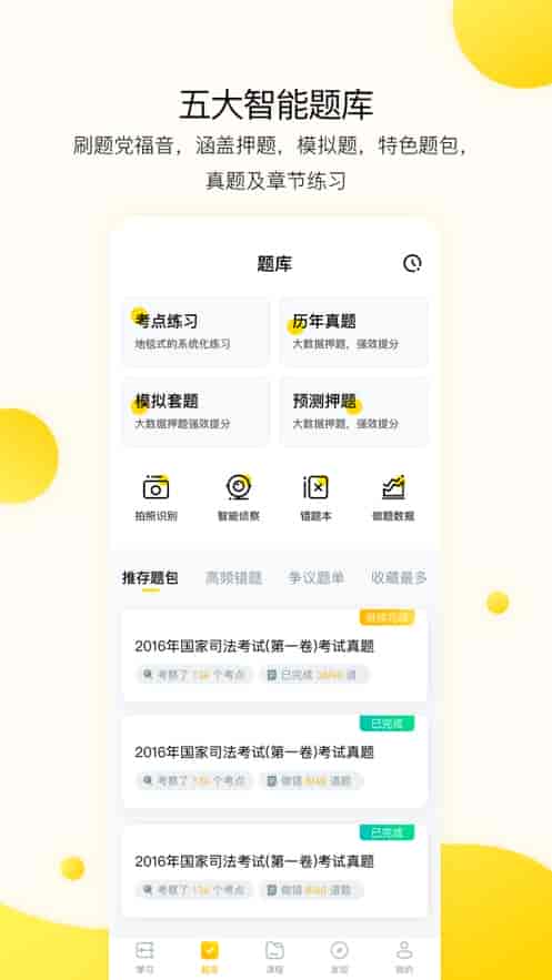 3、五大智能題庫,刷題黨福音,涵蓋押題,模擬題,特色題包。