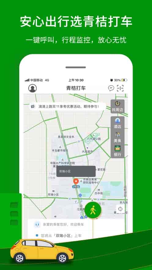 1、安心出行選青桔打車,一鍵呼叫,行程監(jiān)控,放心無憂。