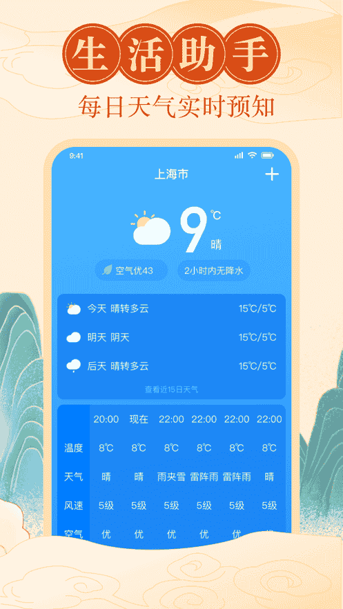 3、精確定位地區,提供24小時天氣預報、未來15天天氣預報等。