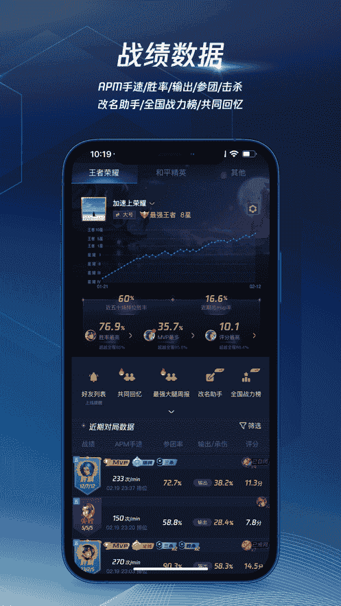 3、戰績數據,APM,手速,勝率輸出,參團擊殺,改名助手,全國戰力榜共同回憶。