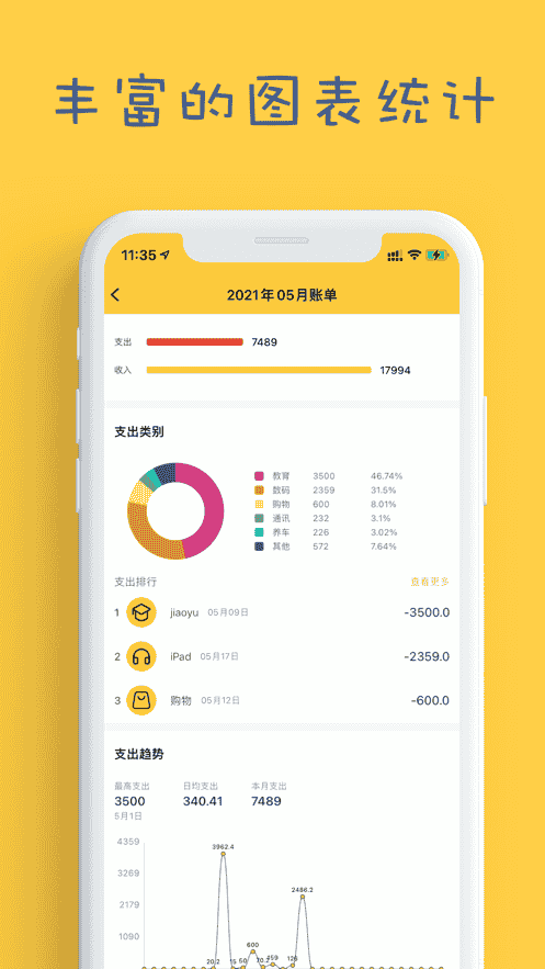 2、提供豐富的數據圖表,對賬目的分類、占比一目了然,幫你快速分析消費情況。