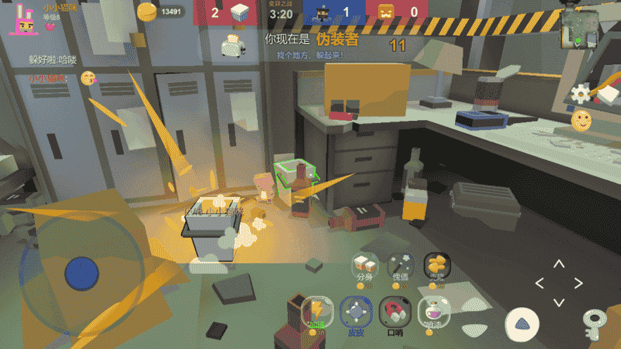 玩家初始變成一個道具,需要找個地方躲起來,瞄準其他設備設施可以使用克隆技能,然后找個安全地方躲起來,還可以傀儡附屬道具用來迷惑抓捕者,在找到喜歡的位置點擊鑰匙技能鎖定位置,千萬不要被抓捕者發現。