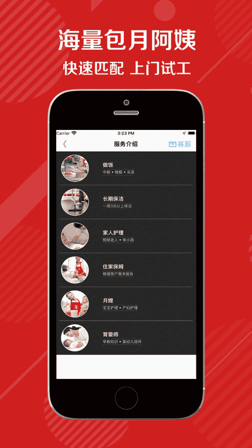 5、平臺服務迅速,通過用戶填寫的定位、時間和需求,第一時間推送至周圍阿姨手機,平均在3分鐘內阿姨都會接單。