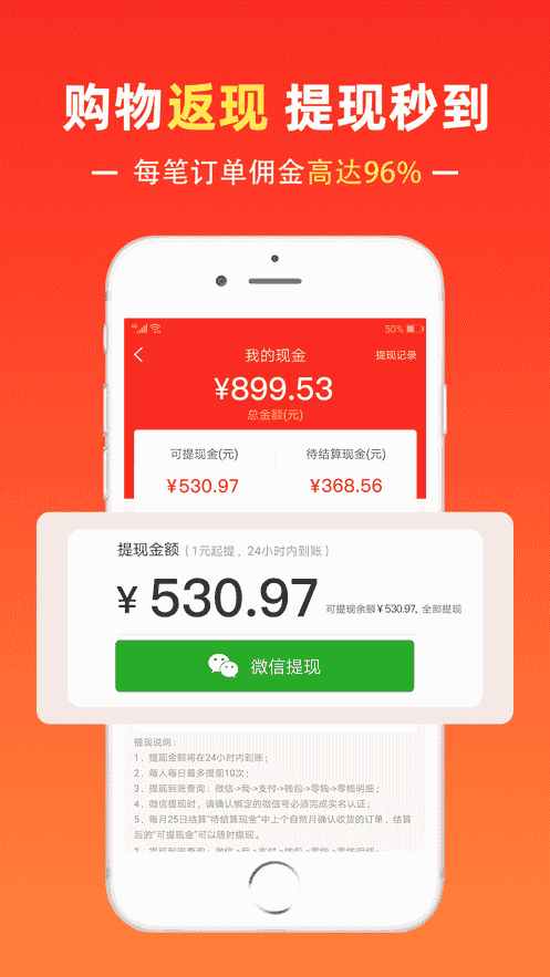 4、購物返現提現秒到,每筆訂單傭金高達96%。